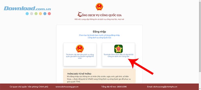 Bước 2: Trong giao diện chọn loại tài khoản đăng nhập, nhấn vào Tài khoản Định danh điện tử cấp bởi Bộ Công an dành cho công dân.
