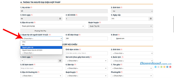 Bước 6: Hoàn thiện chính xác toàn bộ thông tin được yêu cầu. Sau đó, chọn Nội dung đề nghị Cấp hộ chiếu tương ứng với nhu cầu của mình (VD: Cấp hộ chiếu lần đầu, Cấp lại HC do HC cũ hết hạn,...).