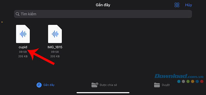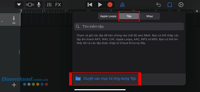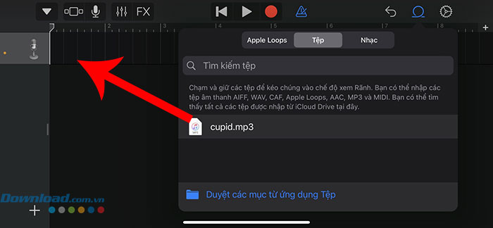 Bước 6: Chọn âm thanh đã lưu vào tệp trước đó và đợi âm thanh xuất hiện trong thư viện của GarageBand.
