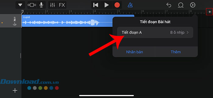Bước 1: Trong giao diện chỉnh sửa âm thanh, chạm vào dấu cộng nhỏ ở bên phải thanh thời gian.