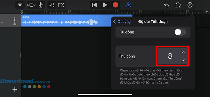 Bước 3: Số bên cạnh Thủ công xác định sẽ có bao nhiêu ô nhịp trong rãnh và mọi người cần thay đổi để đoạn âm thanh dài đủ 40 giây. Để tham khảo, 8 thanh sẽ dài khoảng 16 giây. Nhấn Quay lại sau khi đặt các thanh trong khoảng 40 giây.