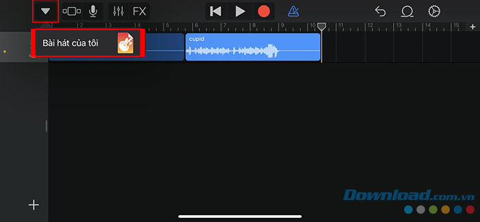 Bước 6: Khi hoàn tất, hãy phát lại âm thanh để đảm bảo hài lòng với kết quả, sau đó nhấn vào mũi tên hướng xuống ở trên cùng bên trái và chọn Bài hát của tôi. Thao tác này sẽ lưu âm thanh vào thư viện GarageBand.