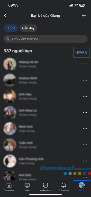 Bước 3: Chạm vào Quản lý ở góc trên bên phải của danh sách bạn bè.