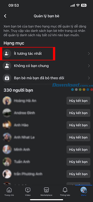Bước 4: Tại trang Quản lý bạn bè, nhấn vào Ít tương tác nhất trong Hạng mục.