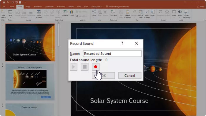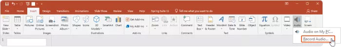 Bước 1: Mở slide mà muốn thêm lời thuyết minh, sau đó vào Insert > Audio > Record Audio.