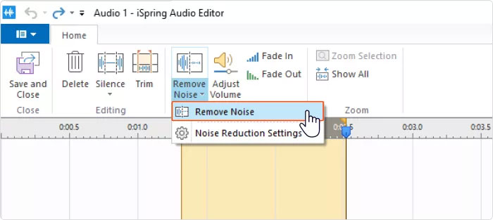 Nếu nhận thấy có tiếng ồn nền trong bản ghi âm, hãy chọn phần có tiếng ồn trên dòng thời gian, nhấn Remove Noise trên thanh công cụ, rồi nhấn Remove Noise một lần nữa để xác nhận.