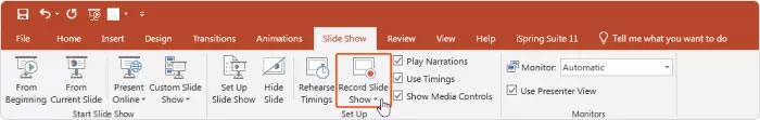 Bước 1: Vào tab Slide Show và chọn Record Slide Show.