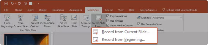 Bước 2: Trong cửa sổ hiện ra, chọn Record from Beginning nếu muốn bắt đầu từ slide đầu tiên, hoặc chọn Record from Current Slide nếu muốn bắt đầu từ một slide cụ thể.