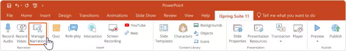 Bước 1: Vào tab iSpring Suite, chọn Manage Narration.