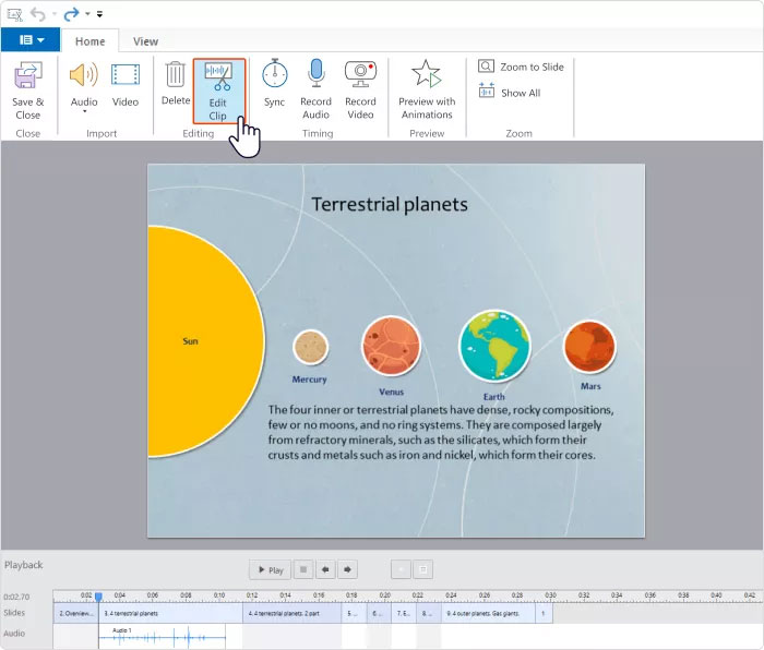 Để thay thế đoạn âm thanh cho một slide bằng đoạn khác mà không xóa toàn bộ thời gian căn chỉnh, hãy nhấp chuột phải vào đoạn âm thanh trên timeline, chọn Change Clip từ menu.