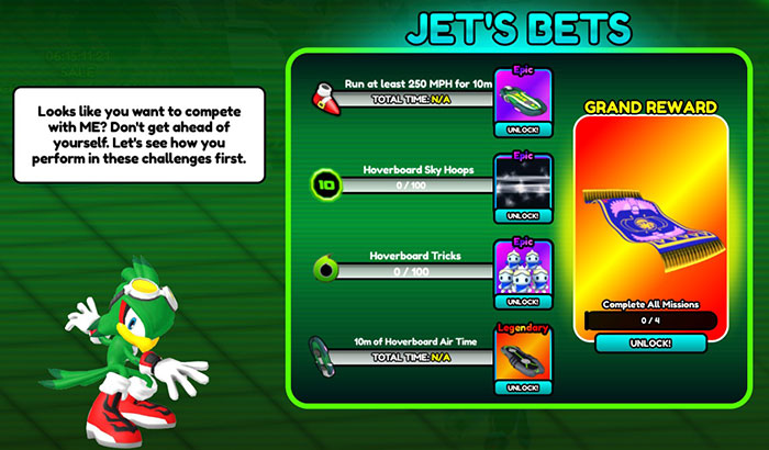 Để có được Jet trong bộ sưu tập nhân vật của mình, người chơi phải hoàn thành 4 nhiệm vụ chính. Thu thập 150.000 Scrap Metal, sử dụng Hoverboard Boost 750 lần, đánh bại Jet 30 lần và hoàn thành Metal City trong 45 giây.