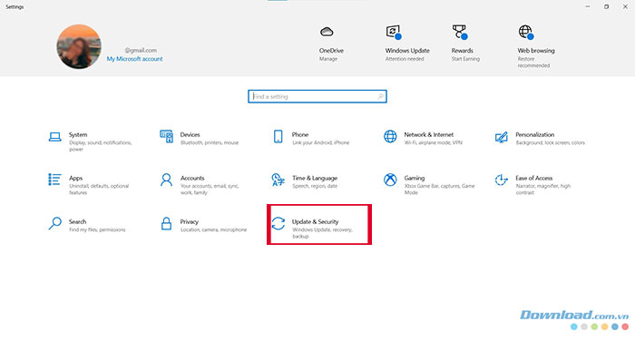 Khi menu Settings được mở ra, hãy nhấn vào Update & Security.