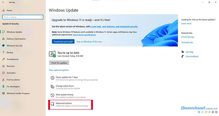 Sau khi nhấn vào Update & Security, màn hình sẽ hiển thị bản cập nhật Windows hiện có. Để hướng dẫn cập nhật các sản phẩm Microsoft khác, mọi người phải đi tới Advanced options.