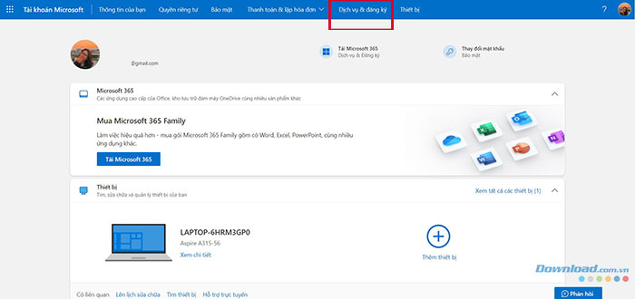 Trong trang Tài khoản Microsoft, nhấn vào tab Dịch vụ và Đăng ký ở thanh trên cùng. Thao tác này sẽ hiển thị phiên bản Office hiện tại đang dùng.