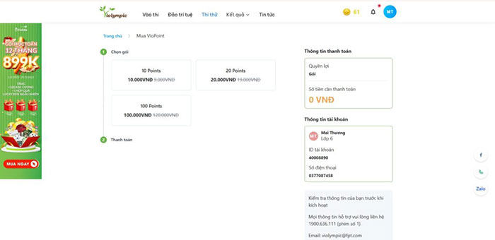 Bước 2: Chọn gói thi thử với số lượt mong muốn và chọn Thanh toán bằng VioPoint. Sau khi người dùng thanh toán thành công thì hệ thống sẽ tự động thêm lượt thi thử vào tài khoản Violympic.