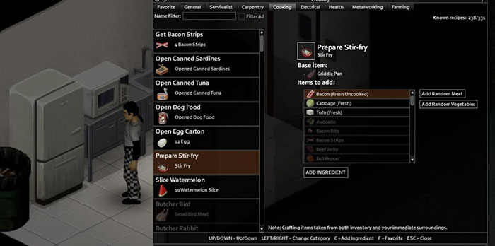 Để nấu thức ăn trong Project Zomboid, người chơi cần có một loại thức ăn và sử dụng lò vi sóng, lò nướng hoặc lửa trại để nấu thức ăn đó. Mọi người cũng sẽ cần phải có một dụng cụ nấu ăn để nấu ăn và chuẩn bị các công thức nấu ăn cụ thể.