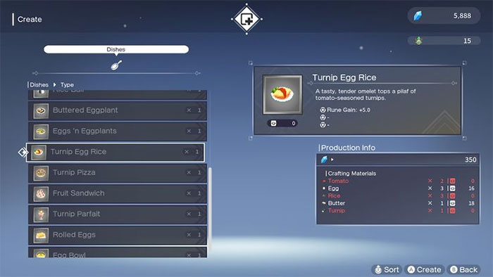 | Turnip Egg Rice | 2 Tomatoes, 3 Eggs, 3 Rice, 1 Butter, 1 Turnip | 350 | +5 Rune Gain |