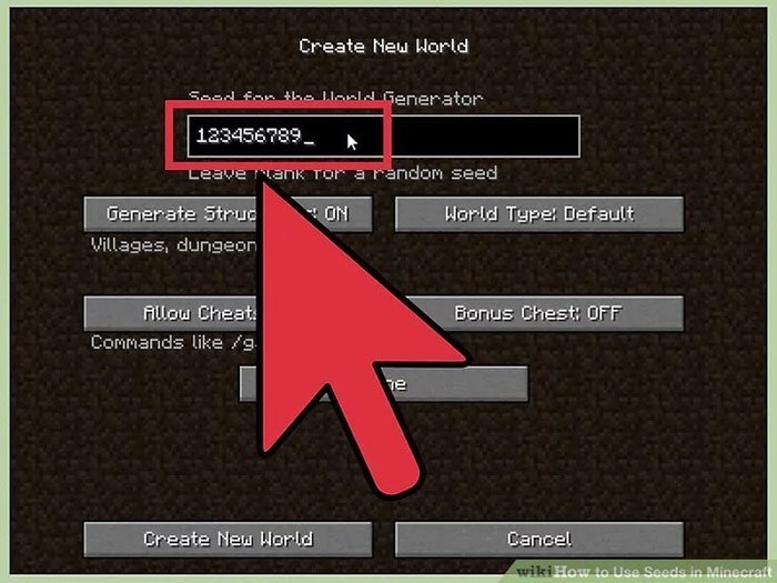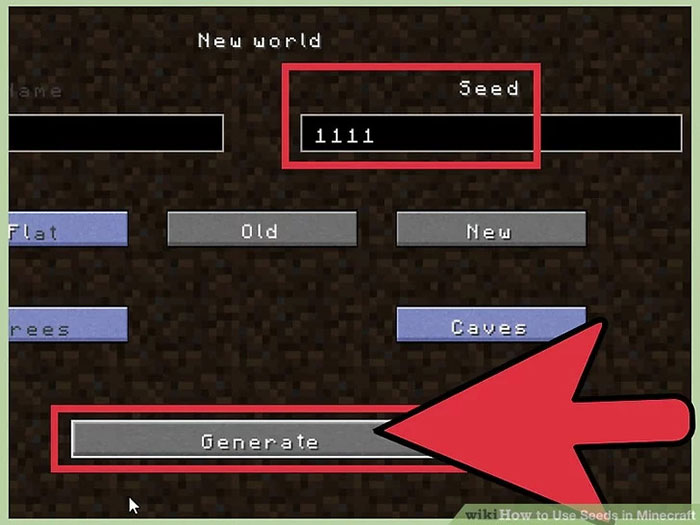 Nhấp vào More World Options... ở cuối màn hình. Ở đầu menu tùy chọn, người chơi sẽ thấy một hộp văn bản trống. Hãy nhập bất kỳ kết hợp chữ cái và số nào vào đây, tất cả đều là seed mà trò chơi sử dụng để tạo ra thế giới mới.