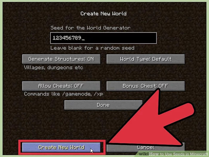 Quay lại menu tạo thế giới (đây là menu có thể nhập tên thế giới ở trên cùng). Chọn Create New World ở dưới cùng. Nhân vật sẽ sinh ra trong một thế giới mới được tạo ra từ seed đã nhập.