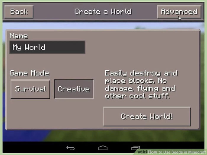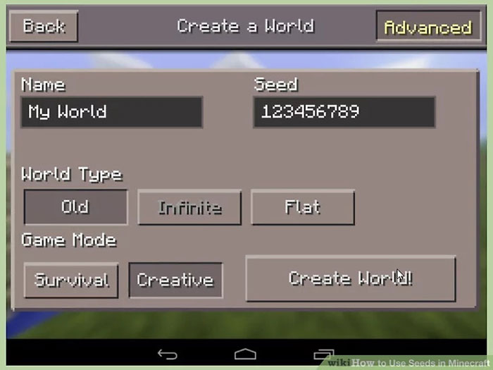 Nhấn vào nút Advance ở góc trên cùng bên phải. Thao tác này sẽ đưa người chơi đến màn hình có hộp văn bản trống với nhãn Seed. Tiếp tục nhập bất kỳ tổ hợp chữ cái và số nào vào ô này.