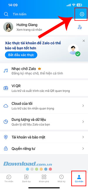 Bước 1: Mở Zalo và truy cập tab Cá nhân. Sau đó, nhấn vào biểu tượng bánh răng cài đặt ở góc trên cùng bên phải.