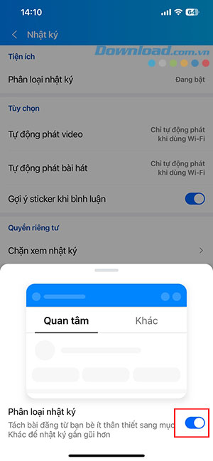 Trước khi tiến hành phân loại nhật ký, người dùng cần kích hoạt tính năng phân loại nhật ký trong cài đặt Zalo. Thao tác này sẽ chia tách Nhật ký thành 2 phần là Quan tâm và Khác.