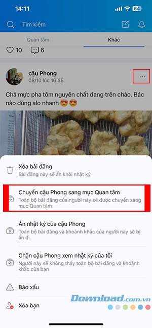Cách 1: Truy cập Khác trong Nhật ký, sau đó chạm vào ba dấu chấm ở góc trên bên phải bài đăng. Chọn Chuyển [tên người dùng] sang mục Quan tâm.