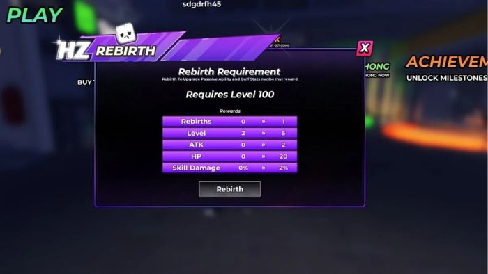 Lưu ý: Việc rebirth chỉ đặt lại cấp độ hiện tại. Người chơi vẫn giữ nguyên toàn bộ vũ khí, vật phẩm nâng cấp, tiền, thú cưng và các vật phẩm chế tạo, cũng như mọi đặc quyền hoặc phần thưởng đã mở khóa. Chính vì vậy, tái sinh là một trong những cách tốt nhất để tăng trưởng chỉ số dài hạn.