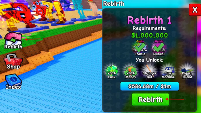 Người chơi cần lưu ý rằng rebirth sẽ reset toàn bộ tiền đã thu thập, người chơi cũng sẽ mất tất cả Brainrot hiện có nhưng vẫn giữ lại toàn bộ Plant, trang bị và trứng.