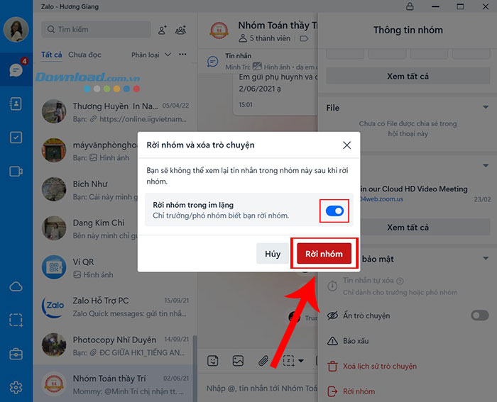 Bước 4: Nhấn để bật tùy chọn Rời nhóm trong im lặng và ấn xác nhận Rời nhóm. Thao tác này chỉ thông báo tới trưởng/phó nhóm về việc mọi người rời nhóm.