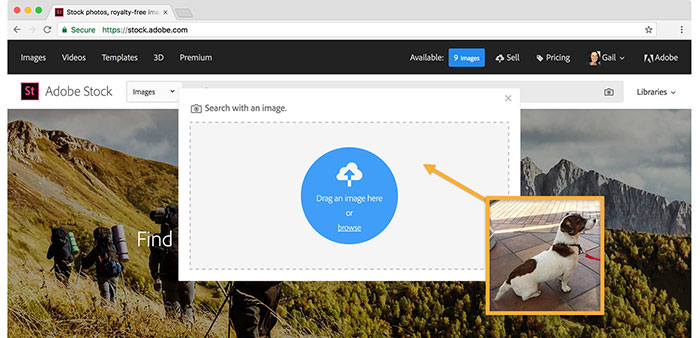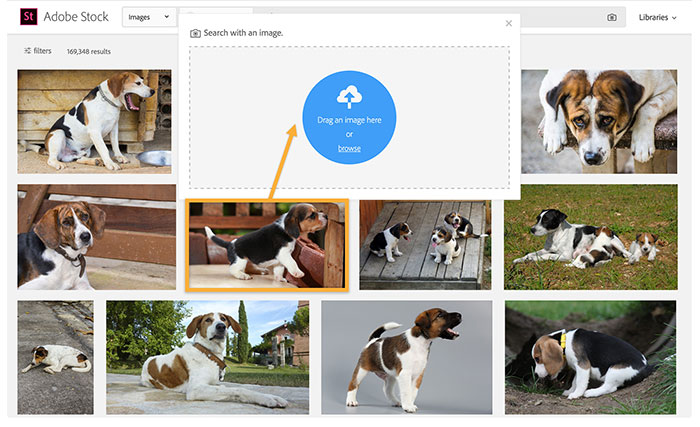 Trên stock.adobe.com, nhấp vào biểu tượng máy ảnh trong trường tìm kiếm hoặc chỉ cần kéo hình ảnh định dạng JPEG hoặc PNG vào hộp tìm kiếm. Adobe Stock sẽ phân tích hình ảnh và hiển thị kết quả trong cửa sổ trình duyệt.
