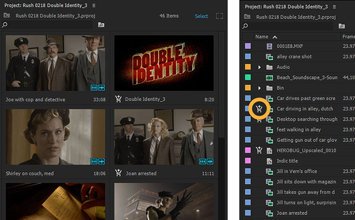 Trong Premiere Pro và After Effects, người dùng có thể cấp phép nội dung từ bảng điều khiển Project. Mở bảng Project và nhấp vào biểu tượng giỏ hàng bên cạnh clip muốn cấp phép và nhấn OK để hoàn tất.