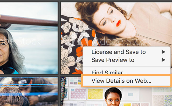 Duyệt qua các hình ảnh trong kết quả tìm kiếm cho đến khi tìm thấy hình ảnh mong muốn. Nếu muốn biết thêm thông tin về hình ảnh, hãy nhấp chuột phải vào hình ảnh và chọn View Details on Web để khởi chạy trang chi tiết của hình ảnh trên web Adobe Stock.