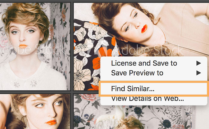 Để tìm hình ảnh tương tự như ảnh được hiển thị trong kết quả tìm kiếm của Adobe Stock, hãy nhấp chuột phải vào hình ảnh và chọn Find Similar.