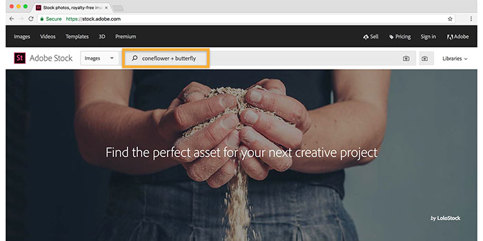 Trong bảng điều khiển Libraries, hãy đảm bảo đã chọn Adobe Stock từ menu trong trường tìm kiếm. Nhập cụm từ tìm kiếm vào đó.