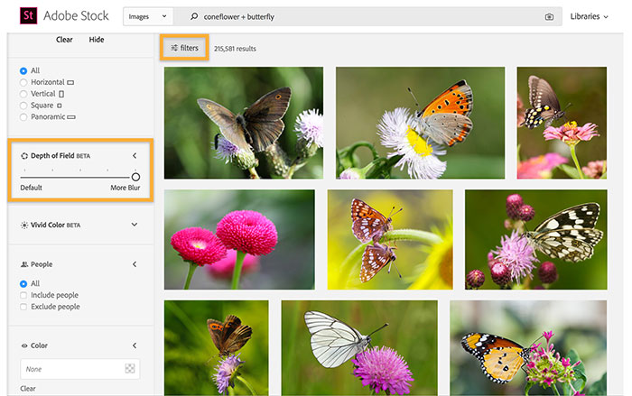 Bắt đầu bằng cách nhập một cụm từ tìm kiếm mô tả; ví dụ đang sử dụng coneflower + butterfly. Nhấp vào tab Filters ở đầu màn hình để khám phá các cách bổ sung để tập trung tìm kiếm hình ảnh.