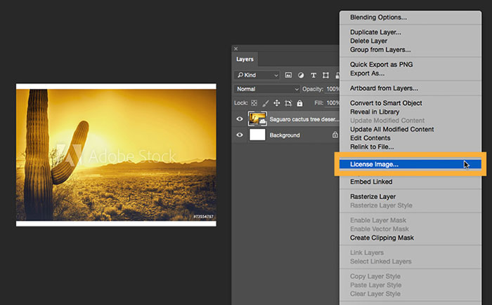 Trong Photoshop, bấm chuột phải vào layer của nội dung và chọn License Image..., sau đó nhấn OK.
