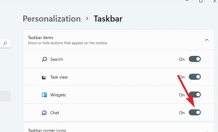 Bước 4: Tắt tùy chọn Chat để xóa lối tắt Microsoft Teams khỏi thanh tác vụ.