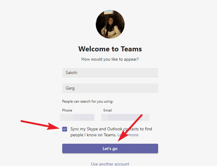 Sau đó, chọn tên hiển thị của mình cho Chat. Để thay đổi các chi tiết này, hãy đăng nhập vào tài khoản Microsoft trên Microsoft Account. Người dùng cũng có thể chọn đồng bộ hóa danh bạ Outlook và Skype để tìm những người dùng cũng có trong Teams. Sau khi thiết lập xong, hãy nhấp vào Let’s Go để hoàn tất quá trình.