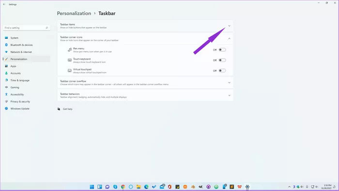 Bước 3: Mở rộng menu các mục trên taskbar bằng cách nhấp vào biểu tượng mũi tên hướng xuống tương ứng của nó.