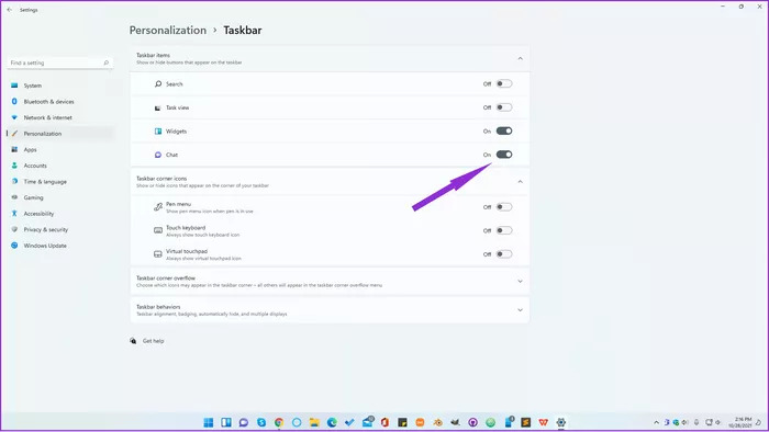 Cài đặt cá nhân hóa cho thanh tác vụ sẽ mở ra và bật nút chuyển đổi ở mục Chat.