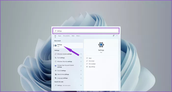 Bước 1: Mở Settings bằng cách nhấp vào Start, nhập Settings vào thanh tìm kiếm.