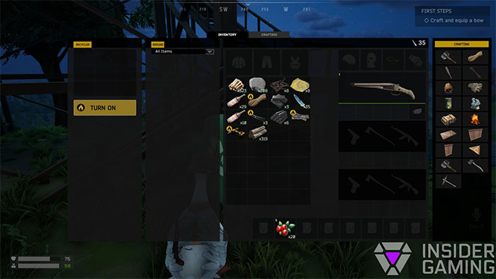 Khi tìm thấy máy tái chế, hãy đi đến đó và tương tác bằng cách sử dụng F. Mọi người sẽ thấy menu trong ảnh chụp màn hình phía dưới. Lúc này, người chơi sẽ cần kéo các vật phẩm từ kho của mình ở giữa đến máy tái chế ở phía bên trái. Điều này yêu cầu không gian trống để chế tạo các thành phần mới xuất hiện, mỗi thành phần chiếm một ô trong máy tái chế.