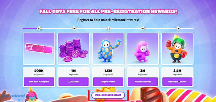 Mọi người có thể truy cập lại trang vào bất kỳ thời điểm nào trong giai đoạn đăng ký trước để xem tiến trình quan trọng được cập nhật 12 giờ một lần. Thời gian đăng ký trước Fall Guys miễn phí sẽ bắt đầu từ ngày 16/05 (17:00 UTC) và kết thúc vào ngày 20/06 (11:59 UTC).
