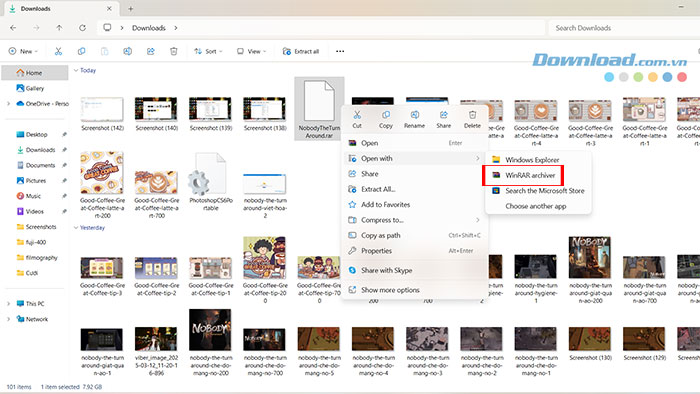 Bước 2: Sau khi file cài đặt trò chơi hoàn tất tải xuống, click đúp chuột vào file NobodyTheTurnaround.rar, di chuột tới Open with và chọn WinRAR Archiver để giải nén tệp.