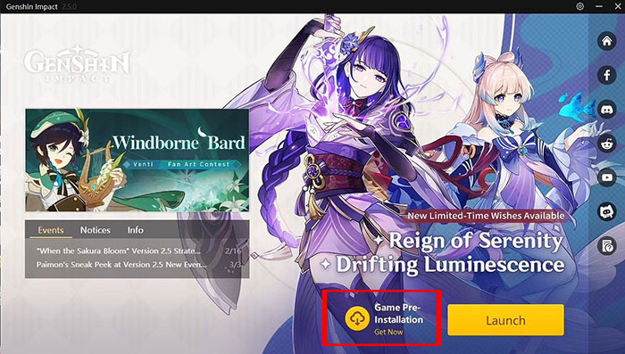 Để bắt đầu quá trình cài đặt trước trên PC, game thủ sẽ cần mở trình launcher chính thức của Genshin Impact và tìm biểu tượng nhỏ ở bên trái của nút Launch.
