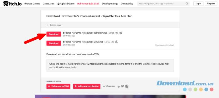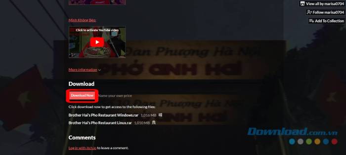 Bước 1: Truy cập trang web của Brother Hai's Pho Restaurant trên itch.io (https://marisa0704.itch.io/brother-hais-pho-restaurant). Mọi người sẽ được điều hướng tới trang Download Brother Hai's Pho Restaurant. Tại đây, nhấn nút Download Now.