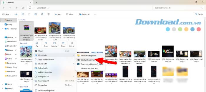 Bước 4: Ngay lập tức file cài đặt trò chơi sẽ được tải xuống. Sau khi file Brother Hai's Pho Restaurant Windows hoàn tất tải xuống, click chuột phải, chọn Open with > WinRAR Archiver để bắt đầu tiến hành giải nén tập tin.