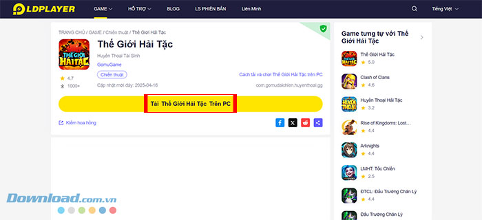 Bước 1: Truy cập liên kết tải Thế Giới Hải Tặc trên PC để điều hướng tới trang download game của LDPlayer. Sau đó, nhấn vào nút Tải Thế Giới Hải Tặc trên PC.