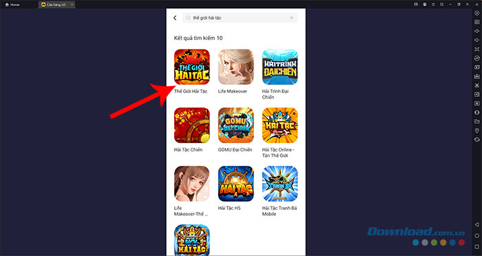 Sau đó nhập Thế Giới Hải Tặc để tìm kiếm trò chơi. Tiếp tục click chuột vào biểu tượng game Thế Giới Hải Tặc từ danh sách kết quả.